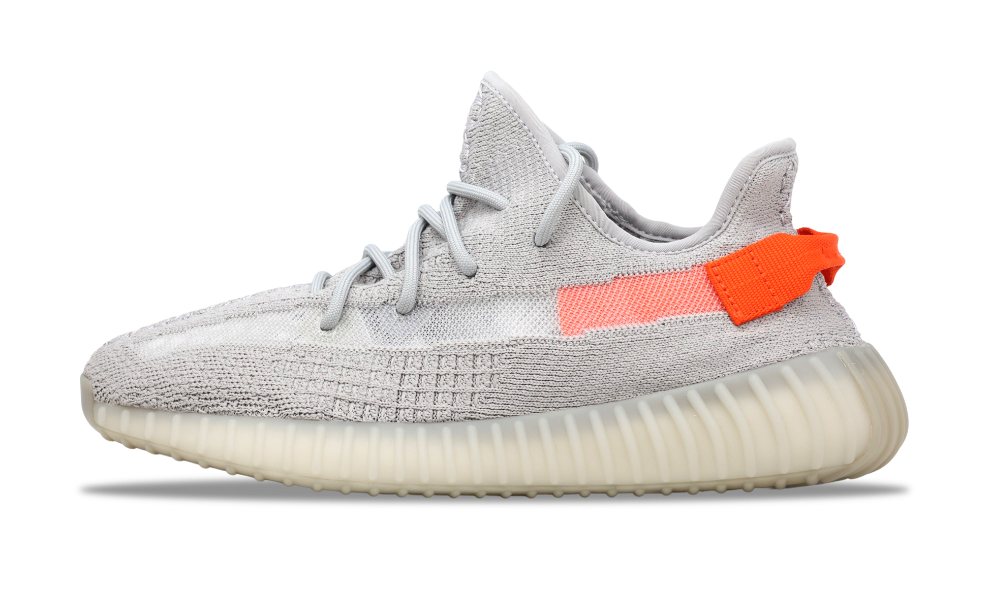 The Yeezy Boost 350 V2 'Tail Light' showcases a pop of bright orange at the stitched textile heel tab, along with a less concentrated shade of the same hue on the signature post-dyed monofilament side stripe. The rest of the upper is constructed from light grey Primeknit in a minimalist one-piece build, complete with a distinctive center stitch running down the vamp. A semi-translucent rubber midsole houses adidas Boost cushioning for a smooth ride.