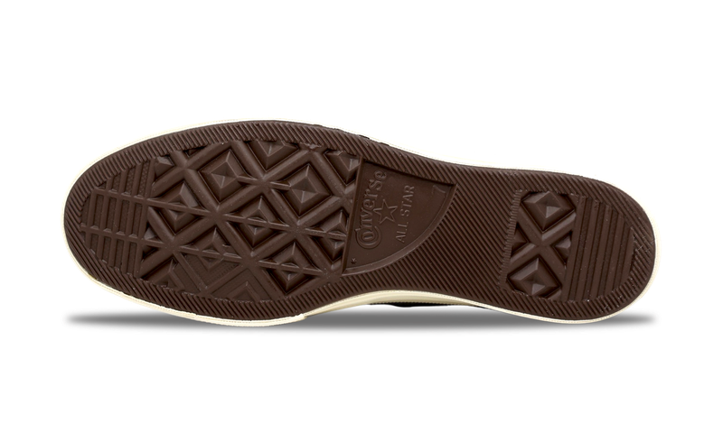 This high-top shoe sits on an egret-colored rubber midsole, brown finish outsole, and toe box that enhance durability. It retains the signature canvas lace-up closure.